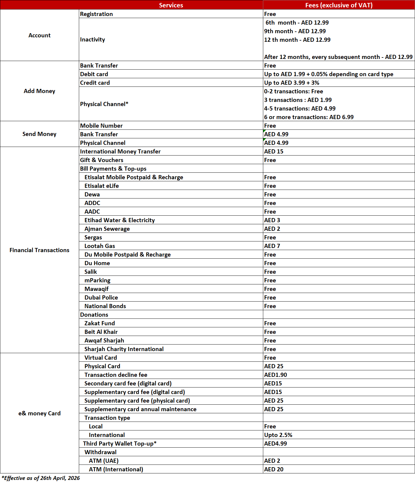 (c) There are no minimum balances required on your e& money account. The currency applied to the e& money services will be UAE Dirhams.